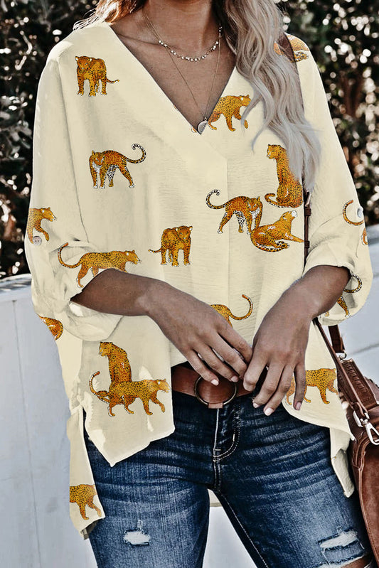 V Legend Elegant : Leopard Print Tab Sleeve Loose Fit V Neck Blouse