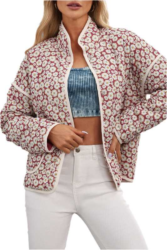 V Legend Luxurious: Floral Print Contrast Edge Stand Neck Coat